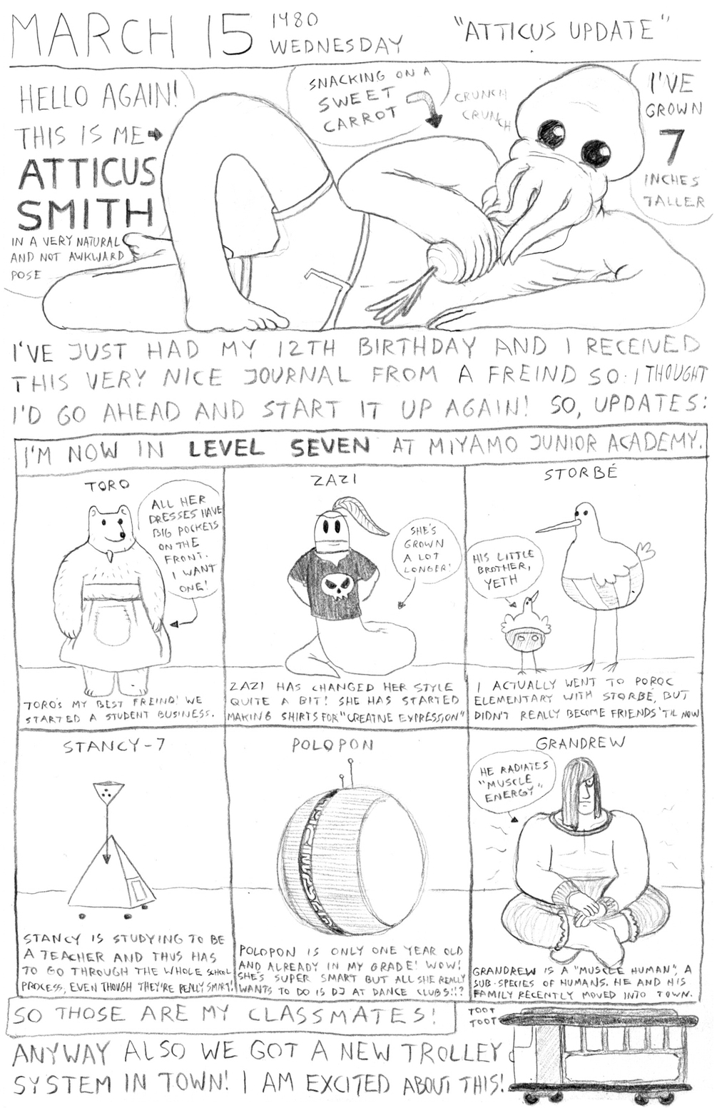 In this volume, Atticus learns from some visiting scientists, eats new foods, and stays at a friend's house when his dad is called away!